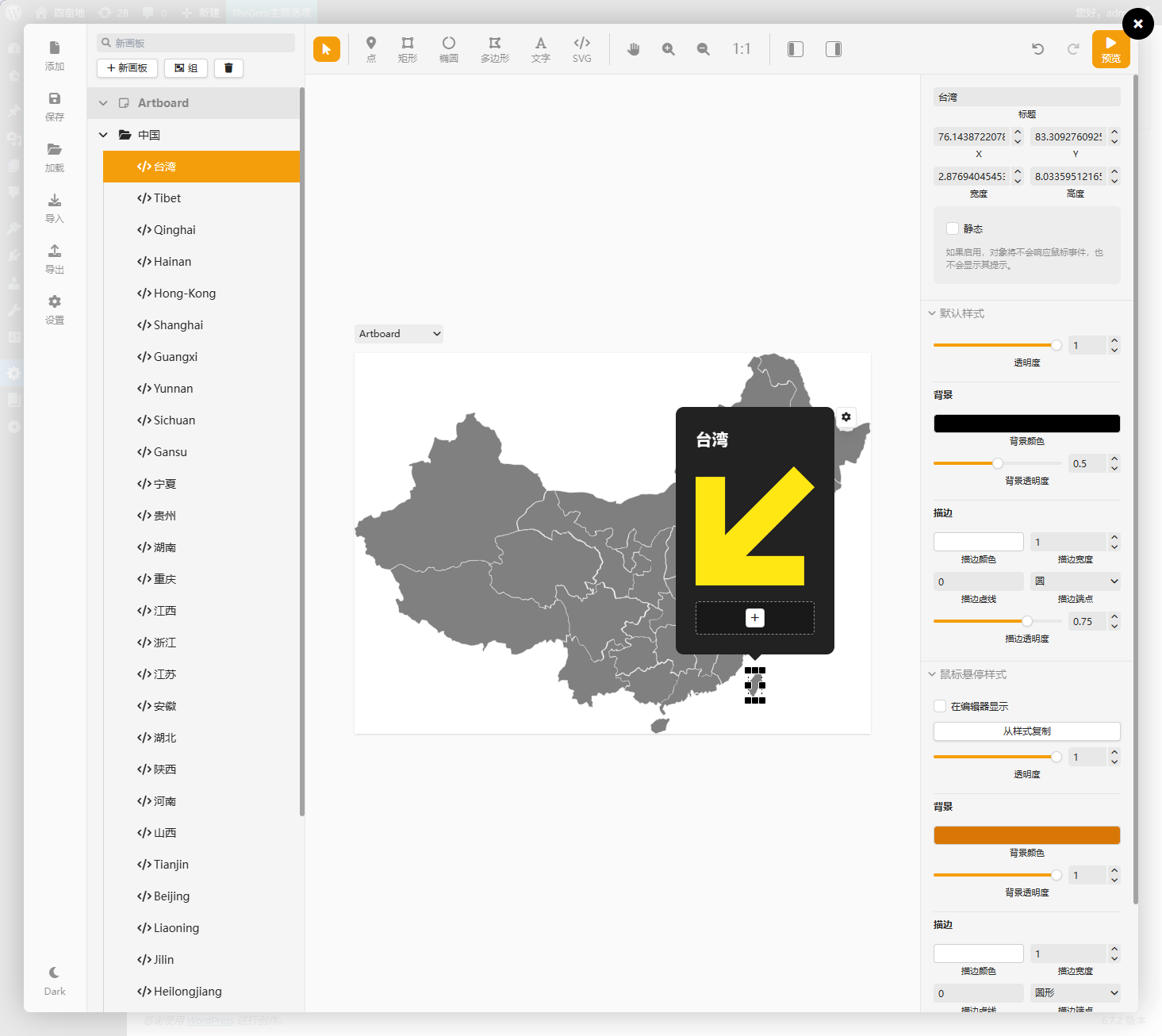 Image Map Pro是一个图片地图插件,此插件可以很方便的把图片分隔成若干不同大小不同形状的部分,鼠标移动到每个部分时显示不一样的提示信息,非常适合做公司分店全国地图位置展示,也适合做产品拆解展示。